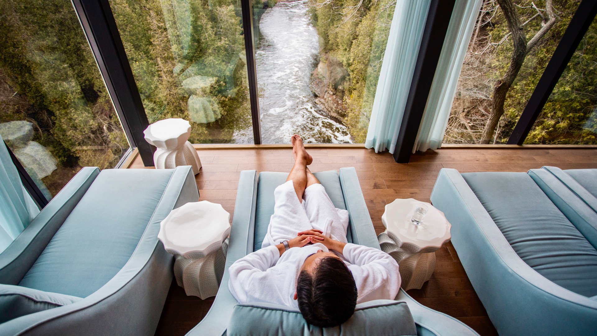 Perched cliffside, the Spa is dedicated to health, wellness and relaxation. Here, a full array of signature treatments have been designed to soothe the mind, treat the body and rejuvenate the spirit. At your disposal for pampering: a state-of-the-art fitness facility and yoga studio, luxury saunas and steam rooms, an outdoor infinity pool and hot tub on a show-stopping viewing deck overlooking the river. Cleansing walks, challenging hiking trails and thrilling bike rides through the gorge can also be arranged.