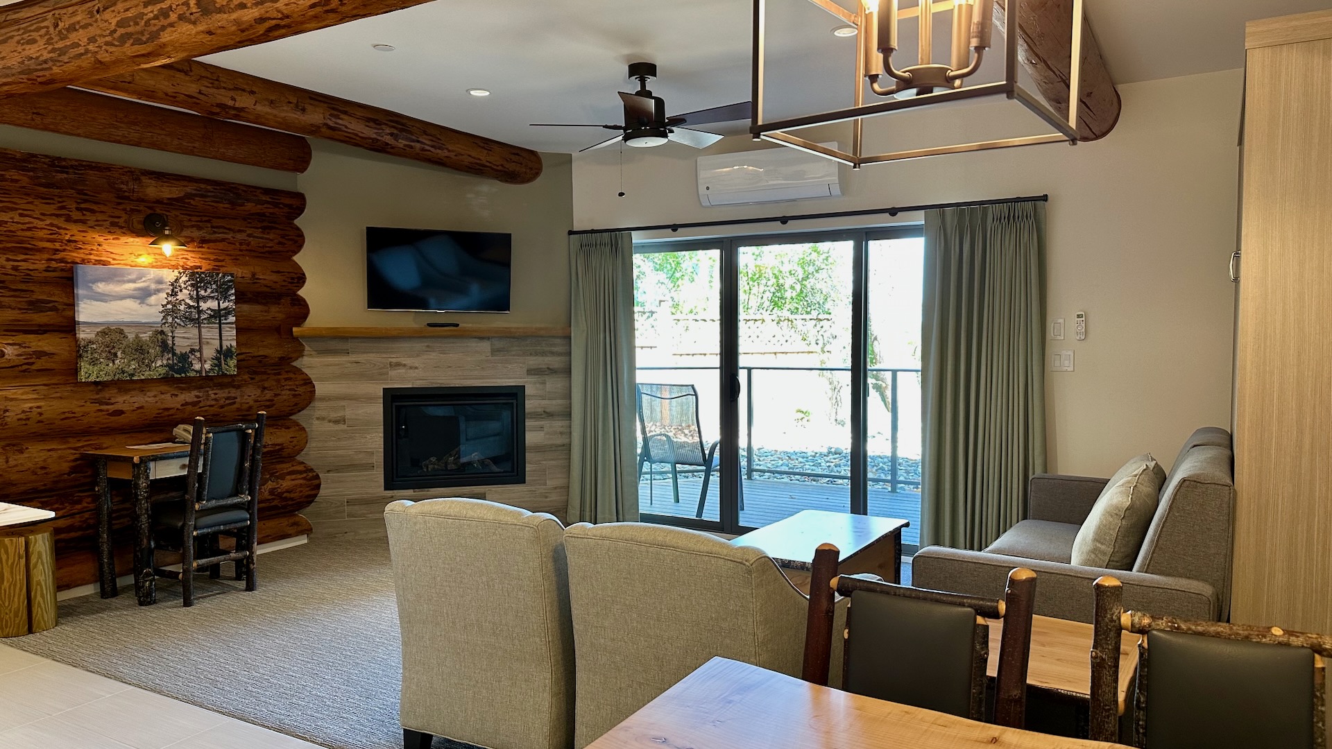 The updated Oceanview guest rooms offer air conditioning, ensuring guests’ comfort even when Salish Sea breezes are insufficient. The rooms boast porcelain countertops, locally crafted Live Edge Design log furniture, and inviting high-efficiency gas fireplaces. Each room offers picturesque views of the Salish Sea and distant islands, with many featuring full kitchens and unique tub/shower concepts in the bathrooms.